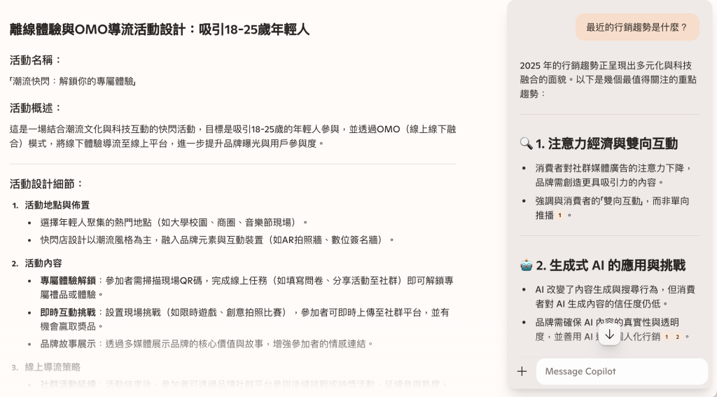 簡單來說,快慢切換取決於你的「問題」與「提示」!遇到難題時,先用快思問簡單定義,再讓AI慢想分析脈絡。實況範例:假設你是行銷專員,籌備新活動。可以先問:「最近的行銷趨勢是什麼?」(快思),快速掌握背景,找出值得關注的重點趨勢,再問:「針對 “離線體驗與OMO導流”,怎樣設計吸引18-25歲年輕人的活動?詳述背後邏輯。」(慢想),讓AI整理詳細策略。一快一慢,AI化身超能助理,省時又高效!