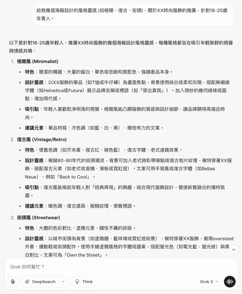 簡單問題(快思答):如設計創作遇瓶頸,可問:「給我幾個海報設計靈感 (如極簡、復古、街頭),針對XX時尚服飾,目標18-25歲年輕人。」AI會秒回風格描述與執行方式,幫你快速抓靈感、補細節。