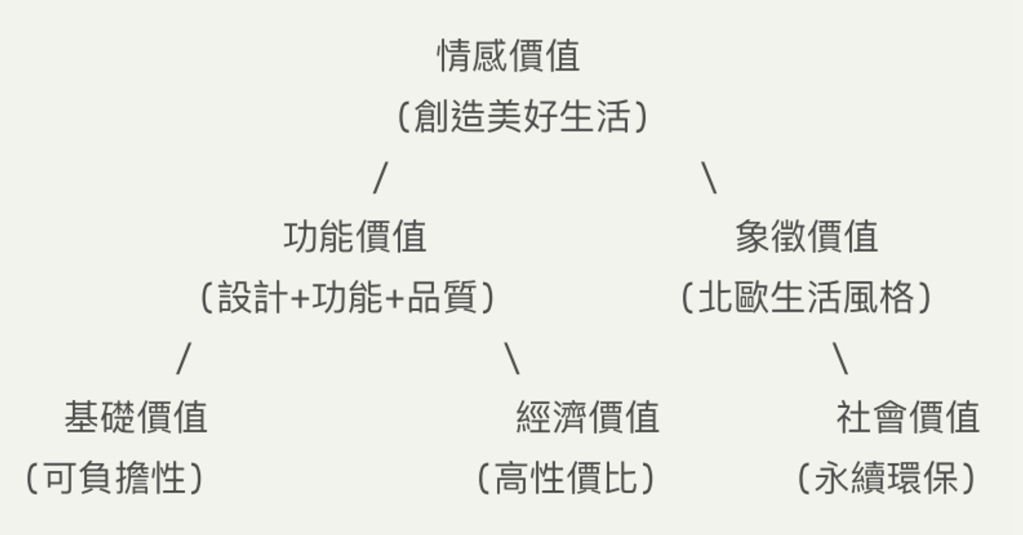 Perplexity Pro 創建了這張樹狀結構圖,呈現IKEA的價值主張金字塔。其核心是「情感價值」,體現品牌致力於「創造美好生活」的理念。從情感價值延伸出兩大分支:功能價值和象徵價值。功能價值進一步細分為「基礎價值」和「經濟價值」,而象徵價值則細分為「社會價值」。由 digitalbrandblog.net提供。