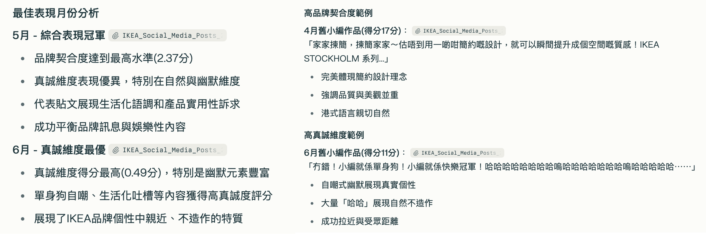 透過 Perplexity Pro 對 IKEA 香港 2025 年 4 至 7 月的社群媒體貼文進行分析,以 6 月 30 日為分界點,比較新舊小編在品牌定位、價值主張傳遞及「真誠」品牌個性維度上的表現差異。結果顯示,舊小編在真誠表現與互動層面相對突出。