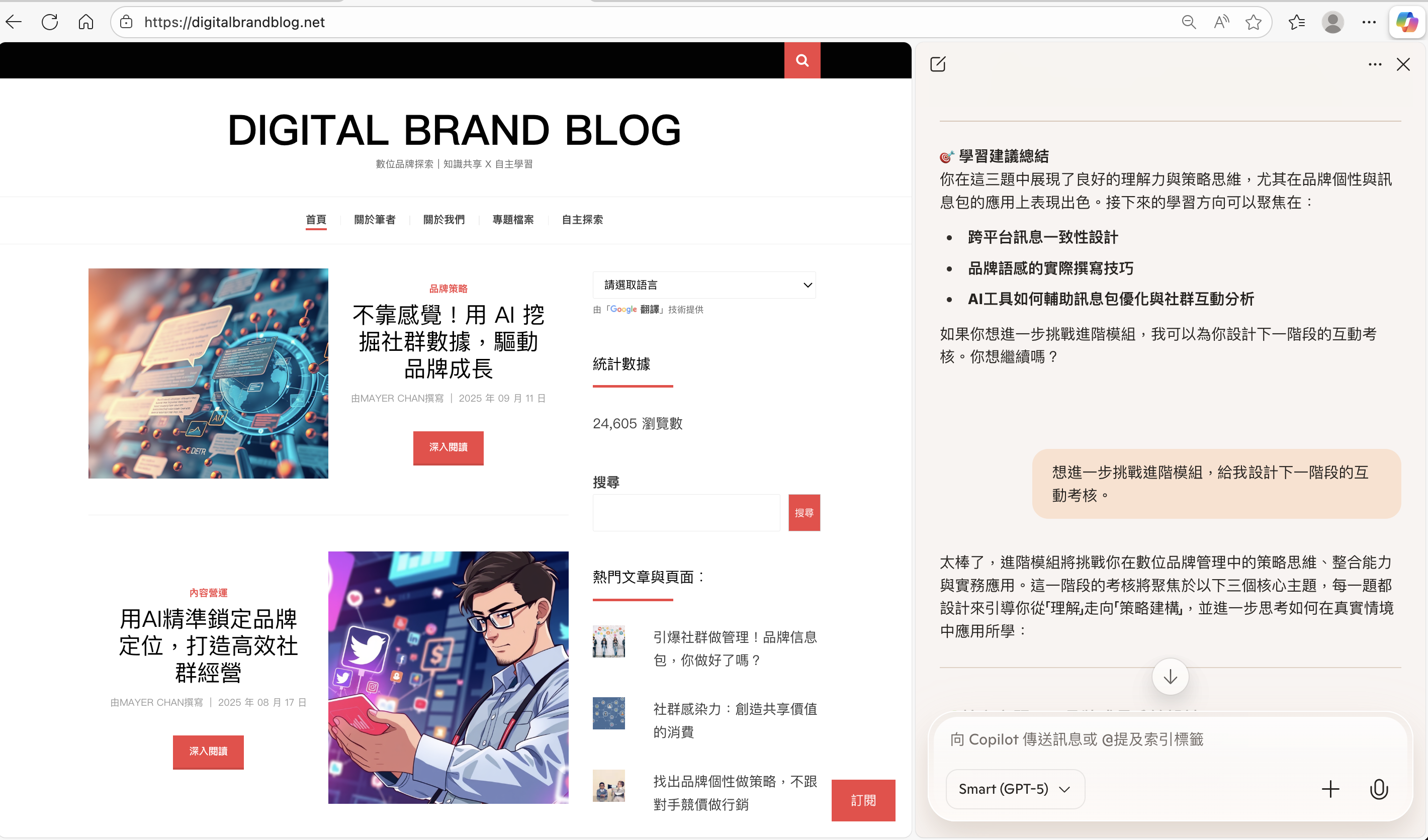 只要在 Microsoft Edge 的 Copilot 中輸入並提交以下提示語,Copilot 即可化身為 digitalbrandblog.net 的專屬學習助理機器人。以下提供三種提示語格式,你只需依據自己的學習主題與程度,填入對應欄位,即可啟動一對一的互動式學習,進行概念歸納、提問引導與知識測驗 。
