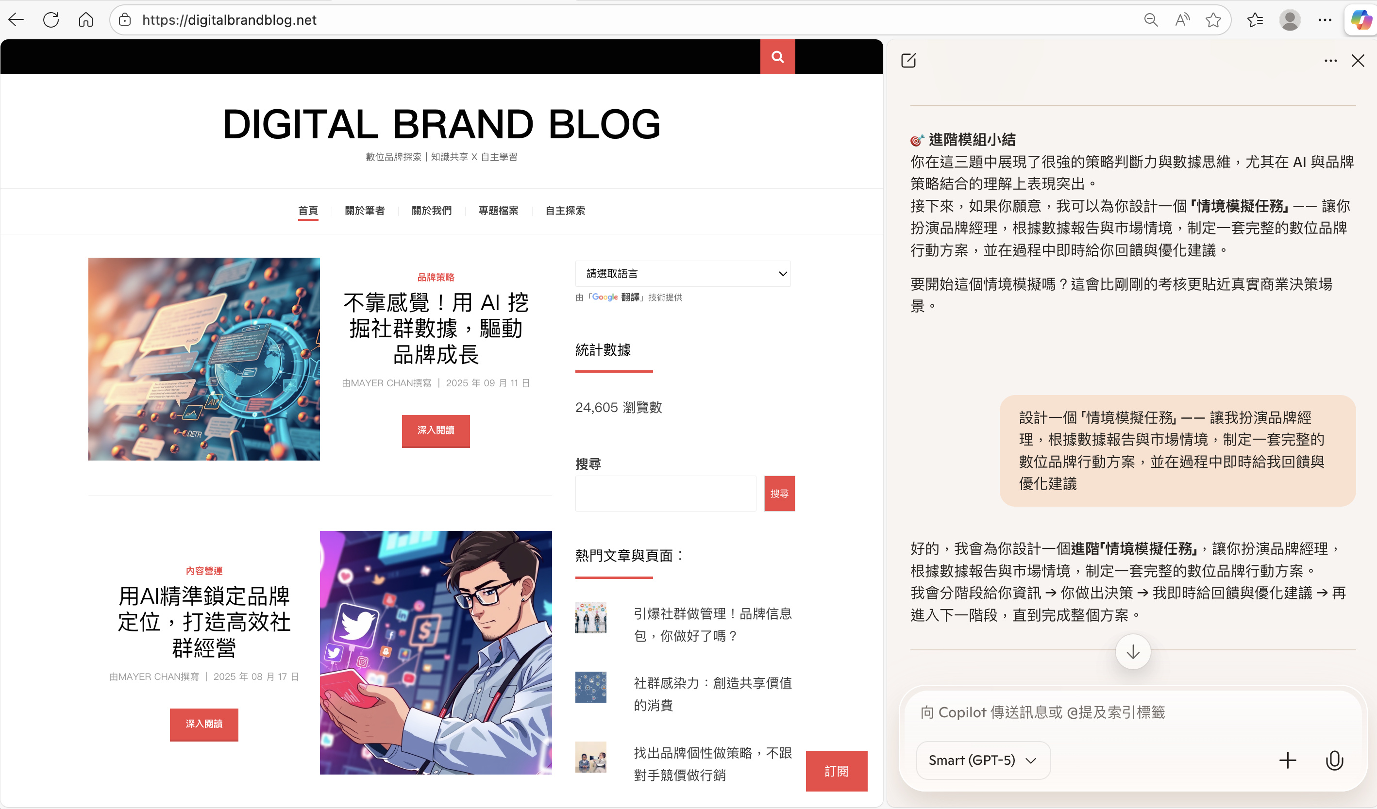 此外,透過指定的提示語格式,可建構 digitalbrandblog.net 的專屬學習助理機器人,在互動流程中,AI 可協助搜尋數位品牌的外部案例,並結合平台內容進行整合式學習。這不僅拓展視野,更能強化理論與實務的連結,培養更具深度的策略思考能力。