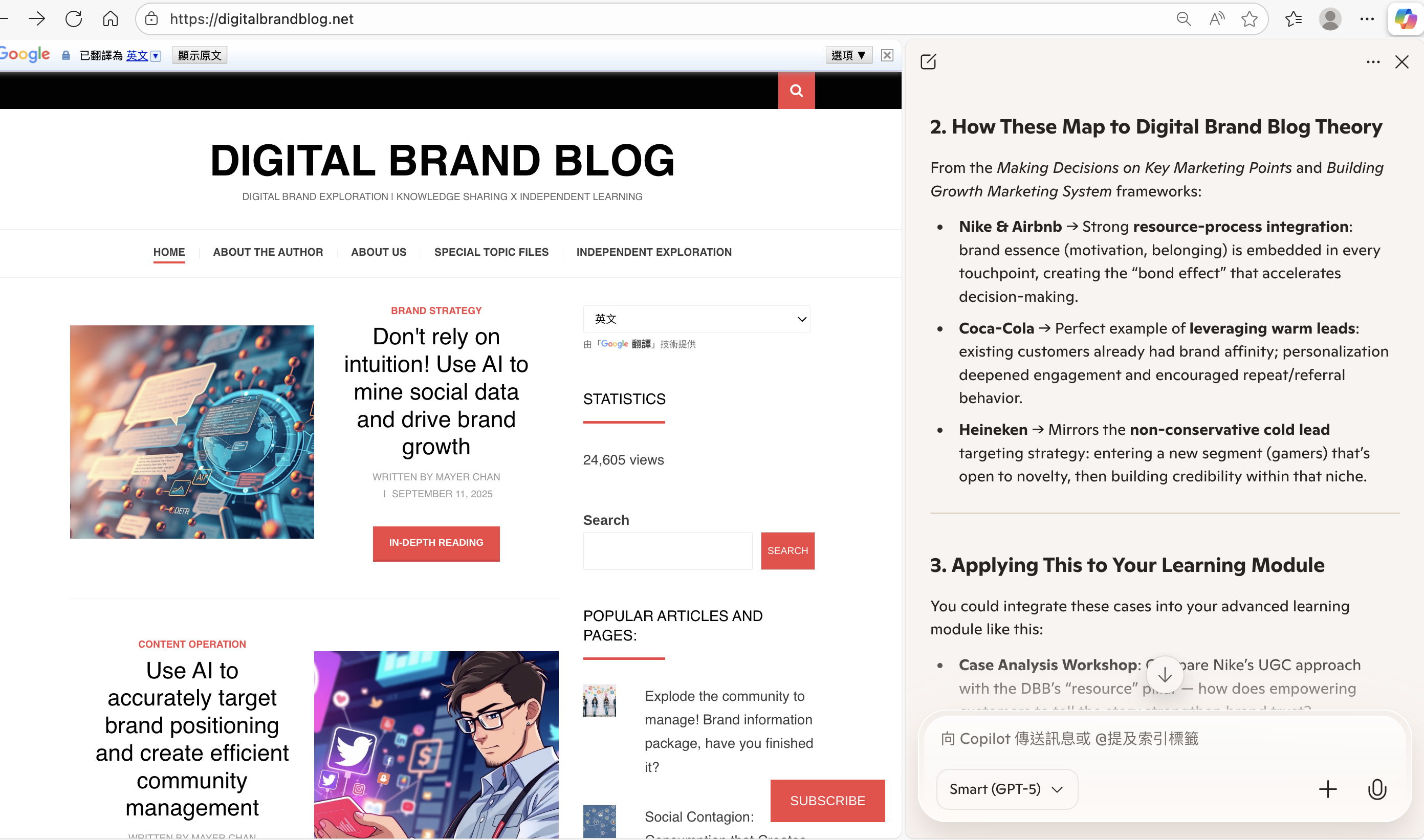 Digital Brand Blog 的一大特色是不受語言限制。你可以在桌面版將內容轉換為熟悉的語言 (如英文),AI 仍能完整解析並啟動對應的學習模組,提供一致且順暢的跨語系學習體驗。