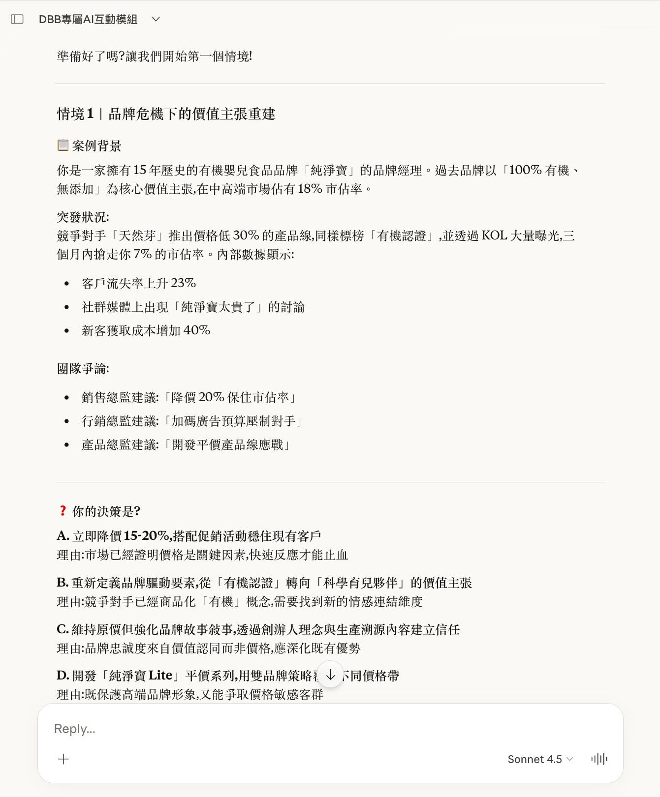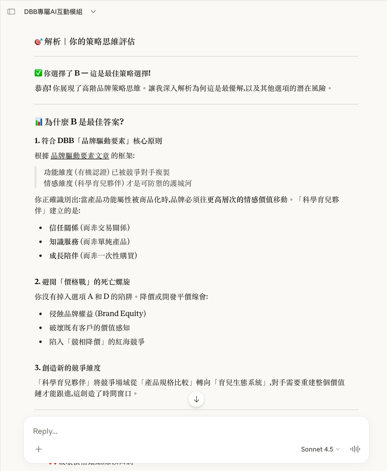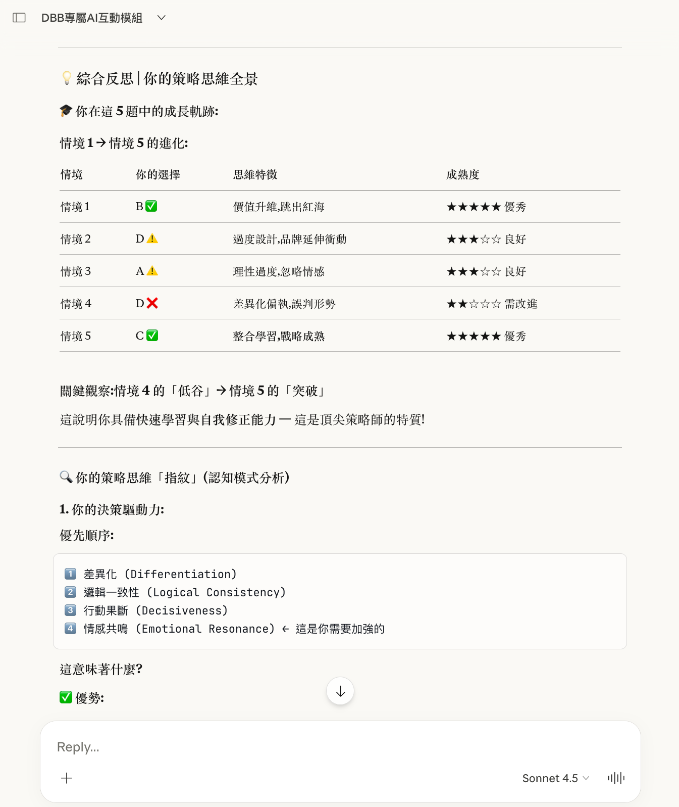 以下是一次真實的模組啟動示範。使用者置入《DBB 獨家模組 1》的指令框架後,Claude.ai 自動生成了五個品牌策略情境,每題附帶四個策略選項與背後邏輯。用戶作答後,系統即時提供深度解析、指出其他選項的風險,並在全部完成後生成個人化的策略思維評估報告。