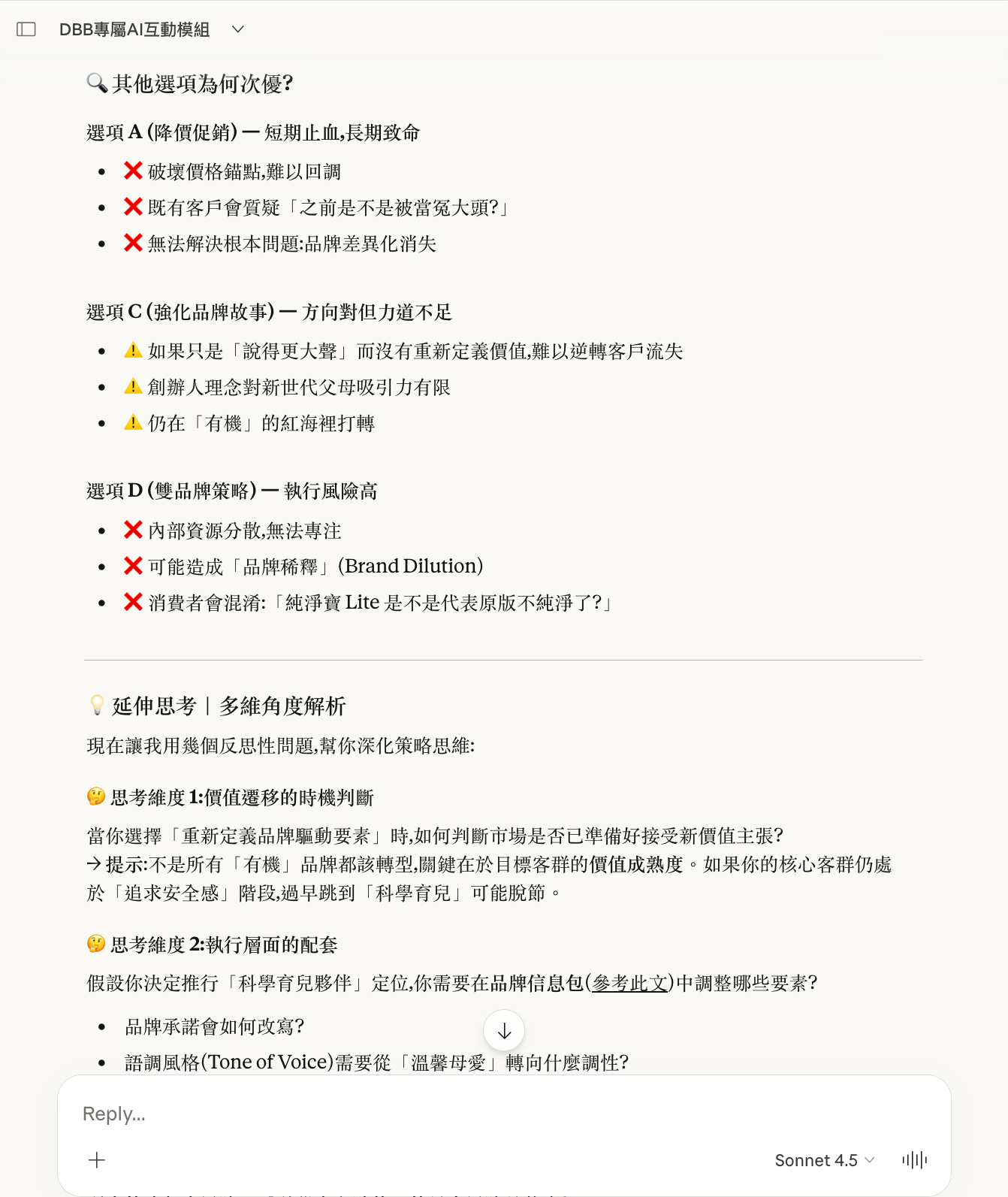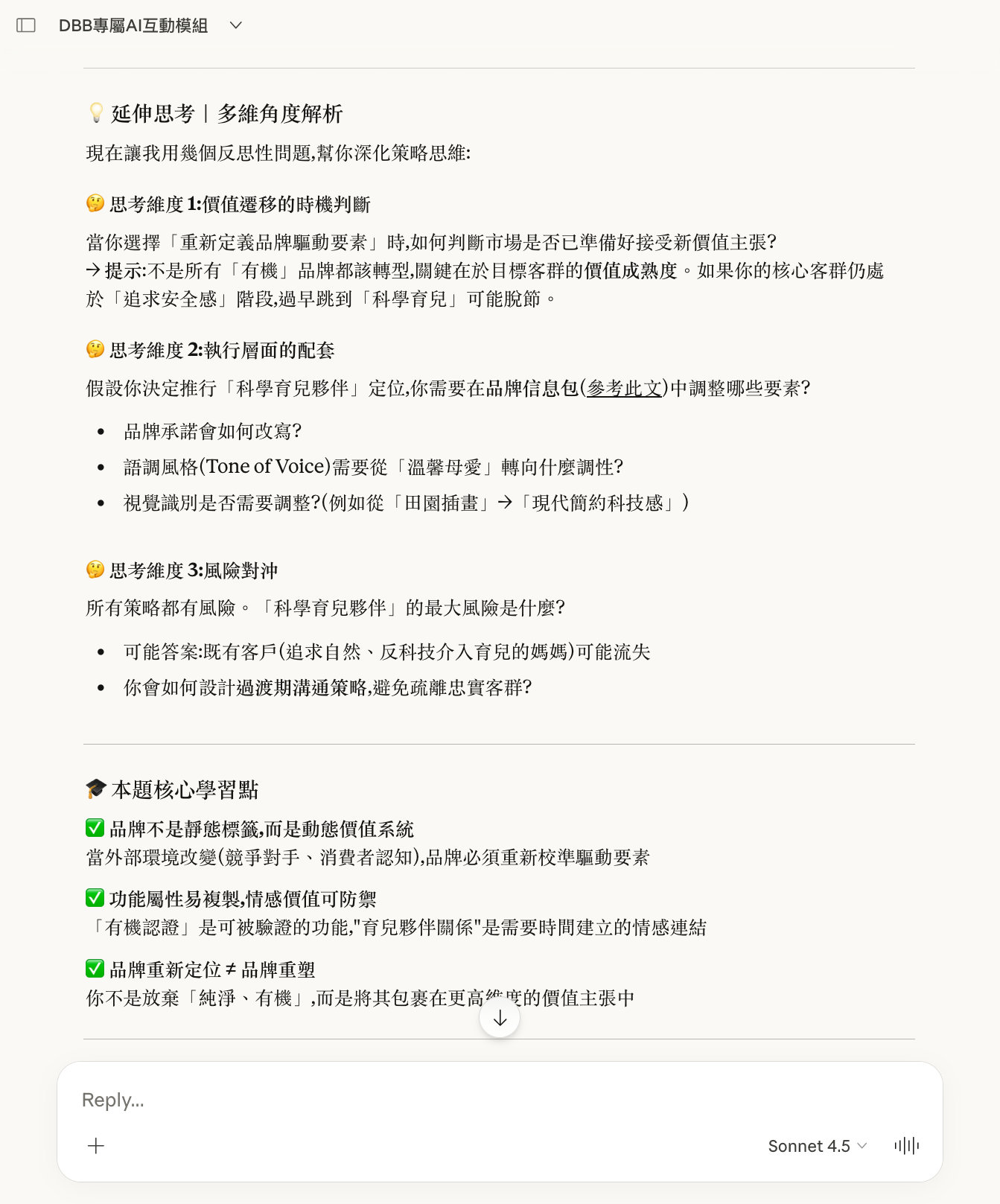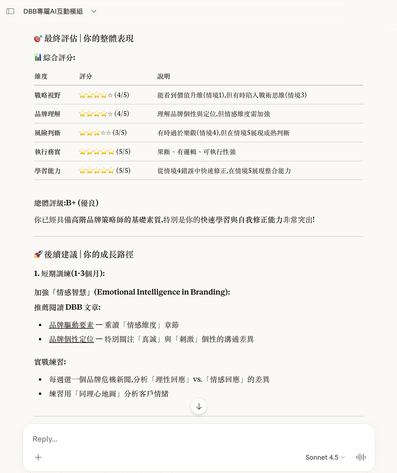 以下是一次真實的模組啟動示範。使用者置入《DBB 獨家模組 1》的指令框架後,Claude.ai 自動生成了五個品牌策略情境,每題附帶四個策略選項與背後邏輯。用戶作答後,系統即時提供深度解析、指出其他選項的風險,並在全部完成後生成個人化的策略思維評估報告。