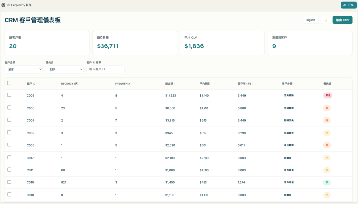 不僅如此,我們甚至能進一步指令 AI 將這些數據轉化為『互動式儀表板 (Interactive Dashboard)』。這讓經營者不再面對密密麻麻的表格,而是能透過直觀的介面進行篩選分眾,深入檢視每一位客戶的詳細資訊。若能進一步結合自動化系統 (Automation),這套數據流更能與 CRM 資料庫實現即時同步,自動觸發後續的跟進工作流。