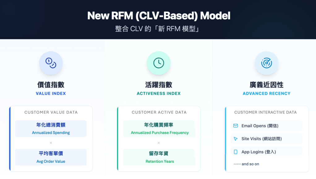 要落實精準的 Targeting,我們需要一套科學的分析工具來衡量顧客價值。經典的 RFM 模型 (Recency 最近消費、Frequency 消費頻率、Monetary 消費金額) 曾是行銷人的黃金標準,但在現今複雜的消費行為下,傳統 RFM 已逐漸顯露出其局限性。
