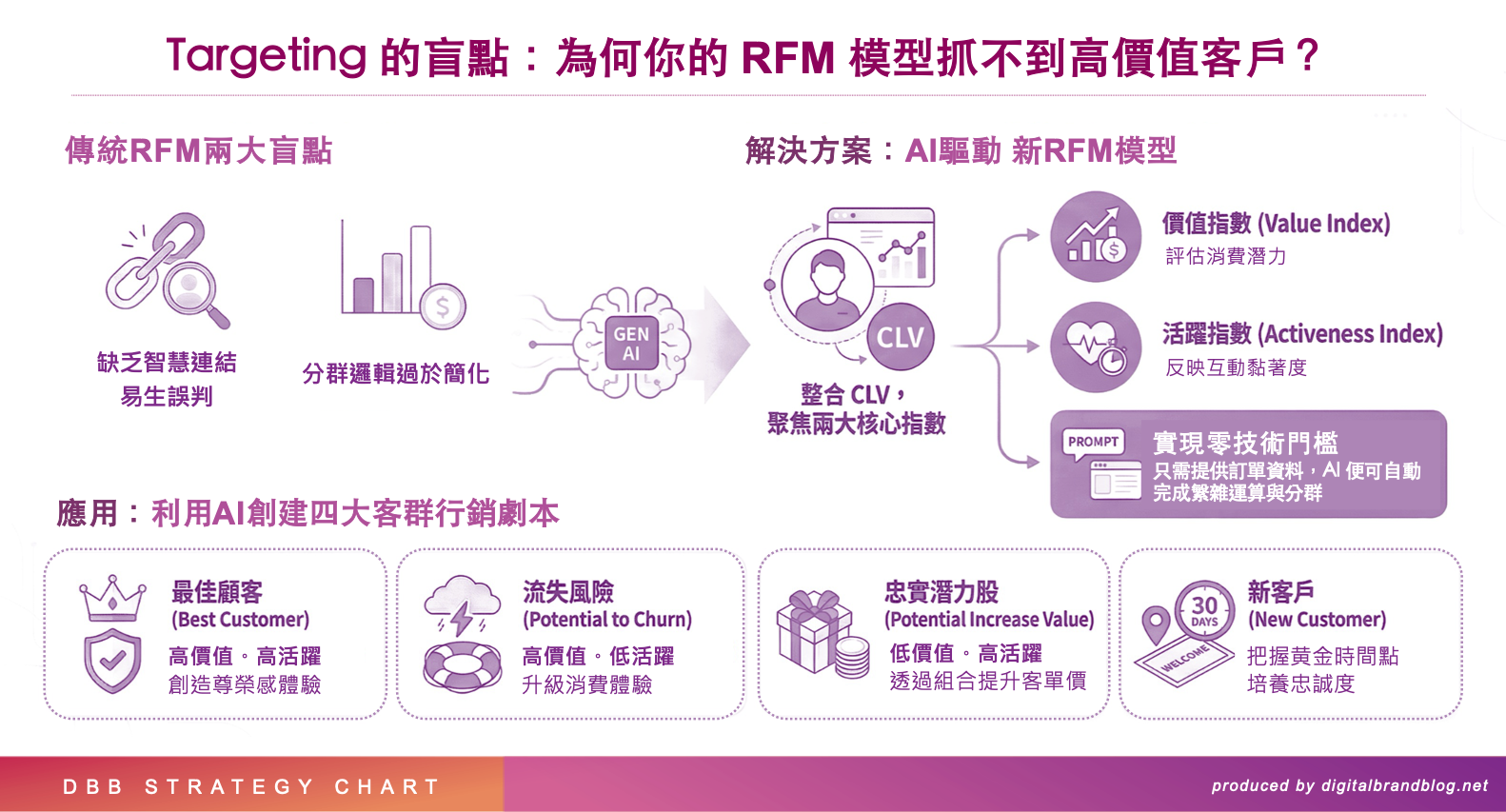 DBB策略觀點:你是否仍依賴『新近度、頻率、金額』切分數據,還是以策略目標為核心,定義分群與劇本以推動 CLV 增長?唯有避免工具牽動策略,並以清晰目標結合 AI 高效執行,才能真正將資源轉化為增長。
